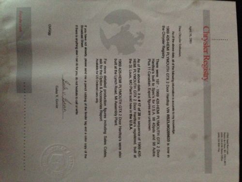 This is a very nice nut and bolt restoration on a rare 1969 Hemi GTX. The body was chemical dipped and rotisserie restored. The only body parts replaced were the right front fender and apron. There was very little rust in the body small patches were welded in the corners of the rear windshield and left rear quarter panel. The floors, trunk and roof had no rust at all. I have pictures of the restoration. This Hemi GTX is 1 of 98 with an automatic transmission built by Chrysler in 1969.