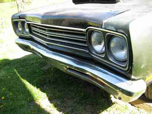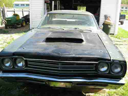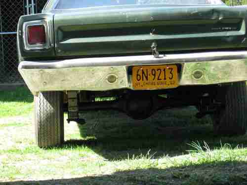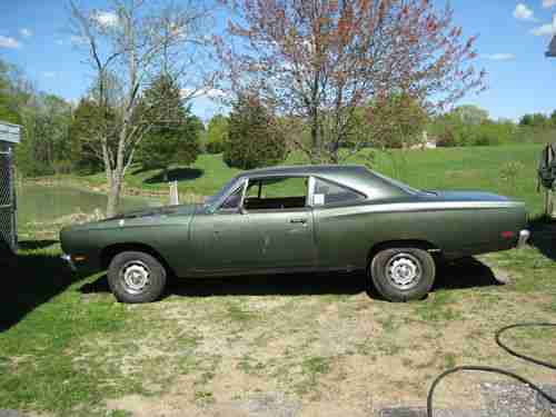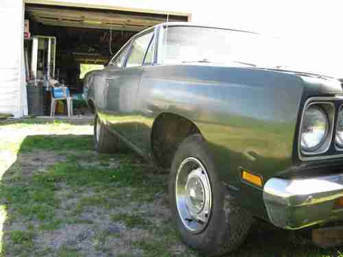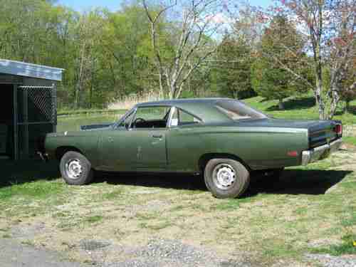 1969 Plymouth Road Runner. Non original 440 engine, 4 Speed manual, manual brakes, non power steering car. Originally a 383 engine in F5 medium green. The previous owner painted the darker F8 forest green over the F5 green. Car has been stored since it was last registered in 1988. This was a literal barn find from a guy who lost his license and had to take it off the road. The car sat for several years in his barn until I purchased it 12 years ago with the intension of restoring it. I towed the car home, changed the engine fluids, cleaned the plugs, ran some gas to the carb via a gas can and had it running within a few hours. The 440 ran very strong and the tranny shifted nicely but I did not drive the car at all. I than began to dismantle the car, taking the engine out, removing the interior, molding, rear end, etc. I did replace the springs but that is the extent of my work. The rest is history as they say. I just can't find the time for it now so she's off to a good home.