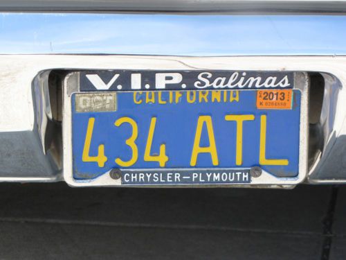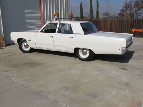 P- Fury K-Police 41- Sedan F-318-2bbl 8-1968 D-Belvidere plant 212316 consecutive number I don't know which department this car served, it was produced in white but shows signs of green paint (green and white was a popular police paint scheme at the time). Being that the car is equipped with a 318 the car likely served with a local P.D. The blue license plates with "A" series letters were issued in 1970 so that is likely when the car was retired from service and stayed in the area ever since, it still wears original license plate frames. Police package 1968 Furys were available with engines ranging from the slant 6 up to a 440 V8. This car still has it's original certified police speedometer, 4 original police only rims and hubcaps, rubber floormat and build sheet.The visibar light bar is vintage correct and is equipped with amber lenses to keep ebay happy, these could be easily changed to any color by the buyer. Don't be confused by the "tribute", "clone" or whatever other term is used by other cars on ebay painted to resemble a police car, this is the real thing. When I got the car I drove it on the freeway about 50 miles with no problems, I haven't driven it any distance since but it starts right up and sounds great. The body looks good, the paint has a few chips. The paint is a decent job, it's not concours but is comparable to most cars at vintage police car shows. The front bumper could use rechroming, the back is OK but not new. The dash has no cracks and the seats and door panels look good, the headliner and windlace could be replaced but are not hanging down. Vintage police cars are always a hit at car shows and parades, drawing more attention than cars costing much more. This Fury is ready to be finished to represent any department you choose. As with any old car it is not perfect, it is being offered with no reserve. Zero feedback buyers must provide their contact information prior to bidding or your bid will be cancelled. Any questions should be asked and inspections done prior to the end of the auction, you are bidding to buy the car, not the right to inspect it after the fact.There is a clear title on the car, the registration expired in October 2013. There will be a small penalty at DMV for California buyers, no penalties for anyone else. The buyer agrees to pay a $500.00 non refundable deposit within 24 hours of the auction end, the balance is due within 7 days of the auction end. Paypal is OK for the deposit, paypal will not be accepted for the balance. The balance must be paid in the form of a bank wire transfer, cashier's check or cash if in person. |