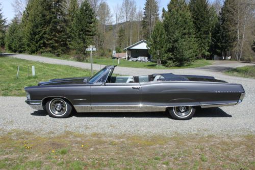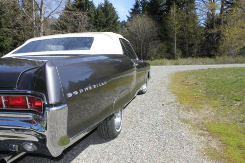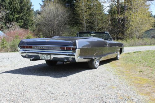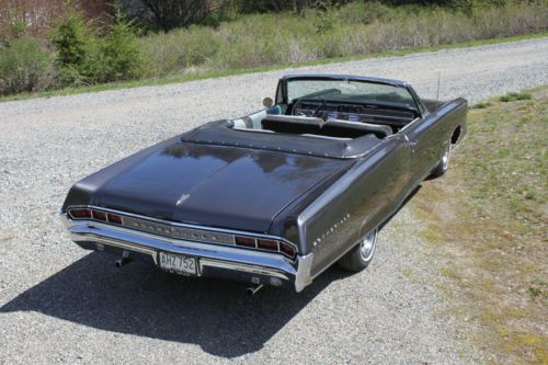 First off, I am listing this car for my father who is the original restorer. He is available for questions and I encourage you to ask any prior to bidding. All questions need to be sent through the contact seller option. Up for auction is this beautiful 1965 Pontiac Bonneville convertible that is being sold as a “period correct” restoration with some minor modifications from original. It has a period correct 333hp 389 big block V-8 and a turbo 400 automatic transmission. It has the Posi-traction rear axle and the very rare and desirable 8-lug wheels with fresh tires. Power windows, power top, power seat, a factory stereo in an uncut dash that is trimmed in real wood that was the trademark of these classic cars. The stereo still has reverb kit. Although it is in non-working condition as finding somebody capable of repairing proved to be difficult. There is no factory A/C option on this car and A/C was never added. Custom cloth velour seats over original factory frames are very comfortable, even on the long road trips. The odometer reads approximately 17,400 miles and was reset at the time the car was restored. There were a couple of donor cars involved in this build, therefore this is not being represented as a “numbers matching” car. So please do not ask if the numbers match, and please do not expect them to. The VIN matches the car as it should be and the title is clean. Only body parts and mechanical components were used from the donor cars, no funny business with the VIN. This car was built to be a driver and that is just what has been done with it. The motor and transmission were both rebuilt at the time of restoration. Therefore the odometer reading is correct for the drivetrain. The convertible top is the original one that was put on the car at the time of restoration. There are a couple small holes in it (see pics) from something inside the well rubbing through it. There will be a brand new top, still in the box included for the new owner to install. The tires were replaced a couple years ago due to a tread separation on one of them. There is less than 500 miles on the tires right now. The car was repainted 4 years ago after a small garage door incident on one front fender. For fear of the paint not matching, the decision to repaint the entire car was made. I will not misrepresent the paint by using words like perfect, flawless, or show winning quality. However, I will say that it is glossy, with a shine that turns heads everywhere it goes, and is great for a “driver car”. Bidding will start at $10,000 with an undisclosed reserve that I will say is set at under 20k. Car is for sale locally and auction may end early if sold