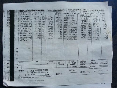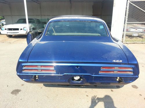 1969 Firebird 400/335 HP HO/Ram Air III Auto, PHS Documented 1 of only 499 built. "Not A Trans Am" ***NOTE*** This is a Rare Option King! Base model firebird cost around $2300. The Trans Am cost was $725.00 over that. This 400 HO special order car was shipped to Germany. Special ordered in 1968 from Myrtle Motors in New York came in @ a whopping $4851.81. In 1969 money that was more than a COPO, Yenko, or an L88 or any of the 8 Trans Am Converts. This car has had resto started & is not complete or finished. Was Frame off rotisseried & painted in Europe. The soldier that owned this car was wounded & received the Purple Heart while this car was in the middle of being restored. At that time the car was hastily bolted together. (subframe & front clip) so the car could be shipped back stateside as he was coming home. some of the cool options & parts never made it back, as well as the driver side fender got damaged in transit. The windows were taped up with plastic & the car was placed in a storage container. The port of entry was Florida. When I found the car it still had port of entry decals on the windshield. I have the European Registration & papers as well as a current Oklahoma Title for the car. This car is worthy of a complete resto & deserves to be put back in its original state of glory. There is no rust in the trunk or anywhere that I have found. if you want to see specific pics let me know. thanks. Car is missing the original Hood Tach & front clip. It has a Trans Am Hood with no hood tach also has TA front fenders & extractors. Drivers side fender was damaged in shipping it has a crack where the fender meets the door. the extractor is in the trunk I also have nice turbo 400 crossmember & driveshaft both very nice & painted, 12 bolt posi 373 gears with Eaton TruTrac & strange axles, Slide a link traction bars, the original shifter & plate, the cowl piece is painted as well. also have the lower ram air air dam or spoiler for the front, the original rear bumper as well as a new rear bumper.The dash bezel is uncut & very nice. I simply cannot put my 572 chevy in it. It does not have & appears to have never had subframe connectors. it should be put back Pontiac powered. I reserve the right to end auction @ any time. car is advertised for sale locally.