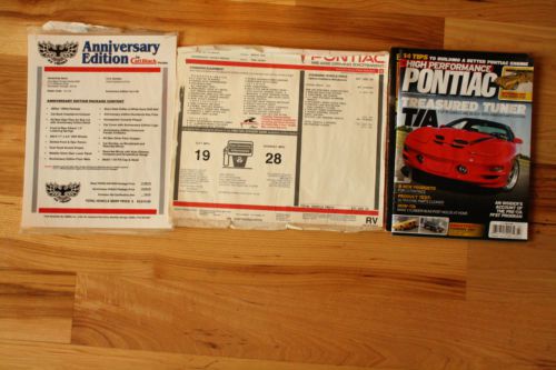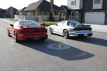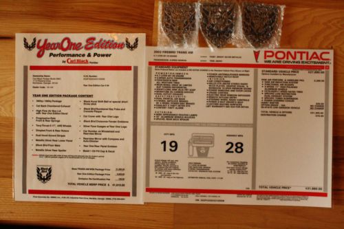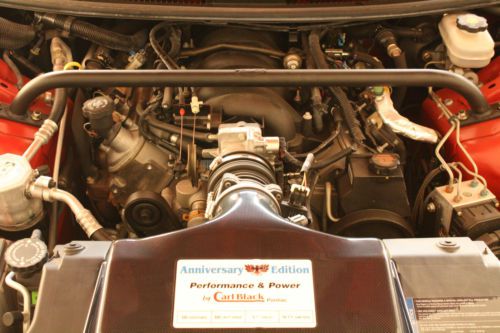 Here is chance to buy two very rare GMMG Carl Black Trans am's. One car is 35th Anniversary edition Firebird #9 (403 miles) only 20 were made and the other is a Year One edition trans am #4 (992 miles) only 8 were made. These cars could only be bought through Carl Black Pontiac in Kennesaw Georgia and were authorized by GM. A lot of these cars have higher miles on them to find one with under 1,000 miles is very hard! These are be the best performing Firebirds of there generation running to 60 in 4.40 seconds and the quarter mile in 12.87. These cars are also in my opinion the best looking by far of there generation. High Performance Pontiac just did an article on the 35th cars last year and it's red just like mine. With Pontiac being gone these cars are sure fire collectibles with prices sure to go up. Both cars are 380HP and 400TQ. The dyno tests on the 380 cars shows 355 rwhp which equates to 400 flywheel hp. All paperwork, magazine articles and extra Blackbird emblems which can no longer be found go with the cars! Both cars smell like new. These cars also have GMMG door tags and stamped manifolds and custom car covers. Call me with any questions 208-761-1932. I have more pictures upon request. 380HP 400TQ Eibach 1.5 inch lowering springs 17x9.5 inch wide Goodyear f1 tires. The Year One car has charcoal painted American racing torque thrust wheels and the 35th car has the American racing 200s charcoal painted rims Slotted rotors for the 35th car and dimpled rotors for the Year One car Chambered exhaust lower deck painted charcoal gray carbon fiber air lid with decal Under drive pulleys Silver faced gauges Year One logos and Blackbird emblems auto dimmer and compass rear view mirror 35th emblems and logos auto dimmer, temp, and compass rear view mirror Blackbird floor mats 35th floor mats 35th car has Hurst short throw shifter with white cue ball Year One car has the Hurst short throw shifter with black cue ball |