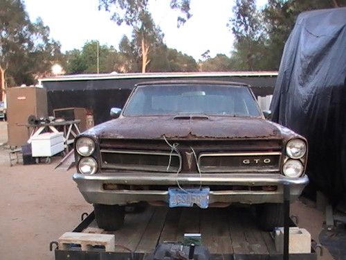1965 Pontiac GTO. Engine is a 389 with a 4 barrel carb One of the original muscle cars. Manual transmission. Engine turns over. All wheel drum brakes. Vehicle has been in storage since 1987. Car is not missing many parts. Odometer says 89,000, could be original. Rally 2 wheels. Frame is solid. Power Steering. All glass is in good condition. California registered with a non-op. The bad about the car is that the body is very rusty. If you have any questions please call (619)-561-3182.