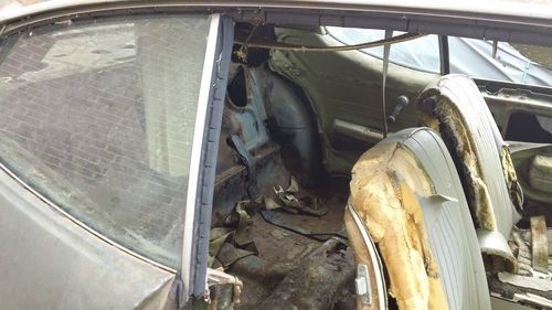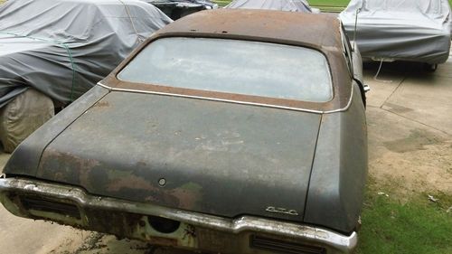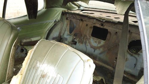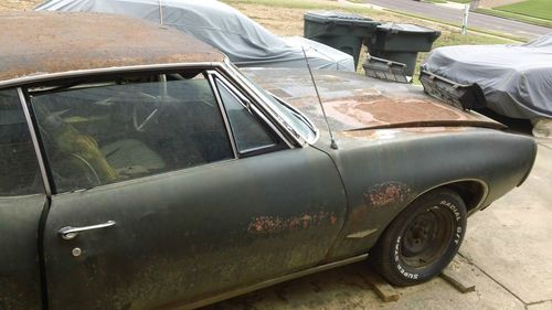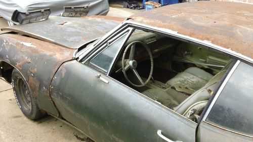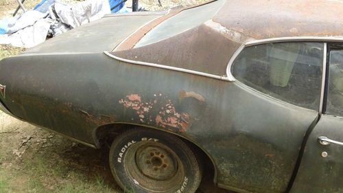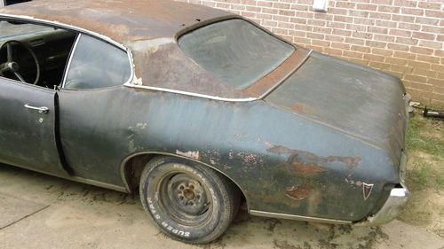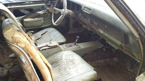 This car appears to be 100% original. The motor and trans look as though they have never been removed. The car needs a complete restoration. The driver side window is broken. All sheetmetal needs work, including the roof. This is a "barn find" that wasn't stored in a barn, but in a woods. The car could use a good LeMans donor.