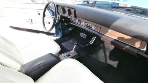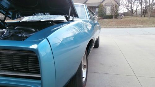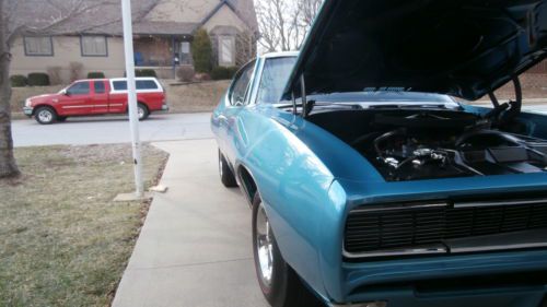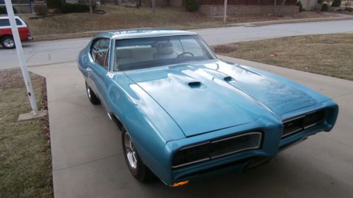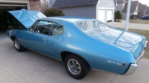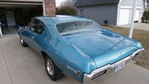 1968 Pontiac Gto factory H.O. meridian Turquoise original color.The Goat was a 1 owner car for 44 years same family in southern California,I am the second owner I have the PHS docs the original keys owners manual and protecto plate. I have not had the car long bought from the restorer planning on keeping for the longhaul but cutbacks mean time to find a new home.Car was restored 8 months ago frame on resto no rust ever great car to start with front clip was taken off car,bottom side and firewall were all stripped and repainted satin black. Was repainted in basecoat clear PPG products block sanded and done right.Motor was done by the original owner before he passed around 3,000 miles on rebuild 4 years ago,one of the smoothest Pontiac motors I have heard YZ original block 16 heads H/O factory manifolds original PX-8 turbo 400 and safe t-track rear 3.55 gears runs really well and tight. The goat has two many new parts to list during the resto. This car is a high end driver not a Barrett Jackson 50,000 frame off. Over the last two months I have put a new radiator in it,brand new 800cfm Sean Murphy quadrajet [$425.00] complete tune up except MSD plud wires still in the box and go with the car.What the car could use things I haven't got to needs a drivers side hood hinge [I have a new one in the box from Ames Pontiac] rear package tray [have brand new one Ames] needs radio antenna I put sound deadner in trunk cut down on road noise-was going to do the cabin but did not find time. Interior brand new white seat covers new carpeting all new rubber seals and plates and headliner,and dash pad. Brand new Gardner exhaust new redline repro tires and restored ralley II. if you are looking for a very nice Goat this is it--Starts everytime with a simple tap of the key! Call Brian with any questions 816-806-8911