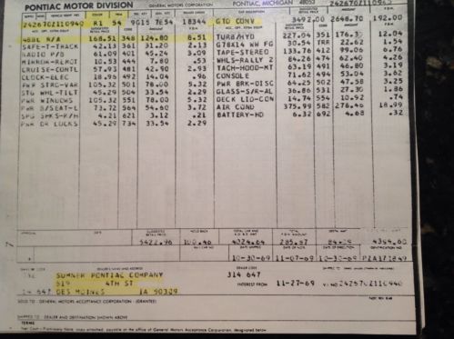 This is one of the most heavily optioned GTOs that I have ever seen. And to be clear, other than a repaint years ago, this car is all original sans the following: Driver’s seat has had a panel replaced Red center caps instead of black (I have the black ones but not on the car) Lock buttons Hood pins Wing Stripes Front Spoiler 15” wheels (They just look better) Aftermarket Stereo Top Water pump and timing chain. I saved original pump I have a tape deck and mounting hardware; not original to car