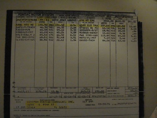 PRIOR FLORIDA VEHICLE. ORIGINAL FENDERS, QUARTERS, DOORS, HOOD, PASS. & TRUNK FLOORS. TWO STAGE, LUCERNE BLUE (CODE 26) PAINT. SR BLOCK, CASTING #485428 (LATE H.O.) 722 RAM AIR IV HEADS EES 7040573 QUADRAJET. ('70 RA III, RA IV, & RA H.O. CALIFORNIA EMISSIONS CARB.) H.O. INTAKE MANIFOLD #483674. H.O. EXHAUST MANIFOLDS: LEFT #478141, RIGHT #9799721. MUNCIE M-20 4-SPEED TRANS. XHP CODE, 3:55 GEAR RATIO SAFE-T-TRACK REAR. POWER STEERING & BRAKES. (FRONT DISC, REAR DRUM). NEW FRONT ROTORS & BEARINGS. NEW SPECTRA GAS TANK & FUEL SENDING UNIT. NEW MONROE GAS-MATIC SHOCKS. REPRO. GOODYEAR POLYGLAS GT TIRES (G60-15). RALLY GAUGES W/TACH. AM RADIO. COMFORT SPORT STEERING WHEEL ADDED. ORIGINAL INTERIOR & DASH (NOT A CAP) WITH THE EXCEPTION OF A NEW PACKAGE TRAY & CENTER CONSOLE LID. NEW CARPET & REPRO. T3 HEADLIGHTS WILL BE INCLUDED IN SALE OF VEHICLE. PHS DOCS, & MAINTENANCE/PARTS RECEIPTS. FOR ADDITIONAL INFO........717-737-3722 |
