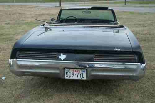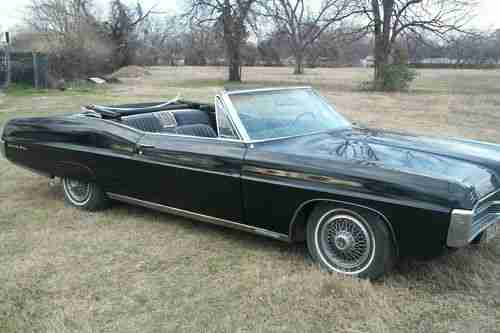 1967 GRAND PRIX CONVERTIBLE 400/350 HP AUTO. CAR WAS BUILT IN ARLINGTON TX. SOLD IN IRVING TX. BEEN IN TEXAS ALL ITS LIFE. HAS FEW PINHOLE RUST SPOTS IN TRUNK PAN OTHER THAN THAT RUST FREE. THE CAR WAS BORN SIGNET GOLD. OTHER THAN THE NEW BLACK PAINT CAR IS ORGINAL. TOP WORKS GREAT HAS A FEW TAERS IN IT. (OPGI HAS NEW FOR 173.50), INTERIOR ORGINAL NEEDS FRONT SEAT COVERS(579.00 PUI), CARPET(149.00-STOCK INTERIORS) AND DASH COVER. CAR IS ALL NUMBERS MATCHING WITH 81000 SHOWING,WAS LAST PLATED IN 1987 WITH 71000 ON TITLE. I GOT OUT OF GARAGE BEEN SETTING SINCE 1987. I CLEANED TANK AND CARB, PUT NEW TIMING CHAIN,GEARS CAM AND LIFTERS. RUNS GREAT, SHIFTS GREAT AND I PUT NEW MASTER CYLINDER ON IT ALSO. GOOD RUNNING DRIVING RARE CAR. NEEDS SOME INTERIOR WORK AND TOP YOU GOT AN AWESOME PIECE OF PONTIAC HISTORY. WHEN WE PAINTED CAR TOOK DOWN TO BARE METAL LOOKED TO HAVE NO BODY FILLER ANYWHERE FIXED A FEW DINGS HERE AND THERE SO HAS VERY LITTLE IN IT NOW.CAR ALSO HAS FACTORY A/C ALL THERE NO BELT SO NOT SURE IF WORKS BUT COMPRESSOR DOES TURN FINE.(MAY GET A CHANCE TO PUT BELT ON AND CHECK IT) I AM OPEN TO ALL OFFERS ON CAR. I WILL ADD LOTS MORE PICS IN A DAY OR 2. PORKCHOP 817-703-1235