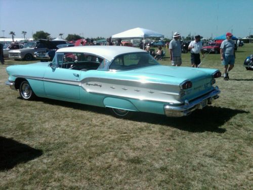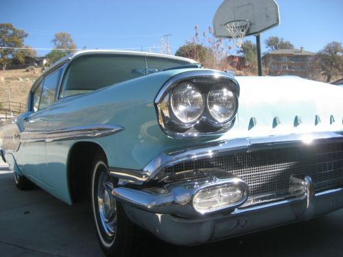 1958 Pontiac Super Chief V-8 370 cid, 270 HP with Hydra-Matic Automatic Trans. Beautiful two toneTropical Turquoise/Shell White 2-Door Hard Top, white side wall tires, no body rust, original interior colors. Clean, power steering, power brakes, receipts for any or all work done. Did a tune-up - plugs, points, rotor, distributor cap, and oil change w/filter in April for the "Bakersfield Classic Car Show". Included will be an original '58 Pontiac Brochure, accessories brochure, and some examples of magazine adds, and the shop and body manuals, and some spare chrome trim, tail lights, etc...1) Left tail signal light is out due to nuetral safety switch. 2) Speedo cable popped out of speedometer at reading on odometer(may have driven less than 1,000 miles since) 3) cable to heat control on heater needs replacing. 4) Small rip in headliner. 5) Driver side seat needs restiching. 6) Shift indicator needs to be fixed....always starts, and drives strong, and stops strong too.