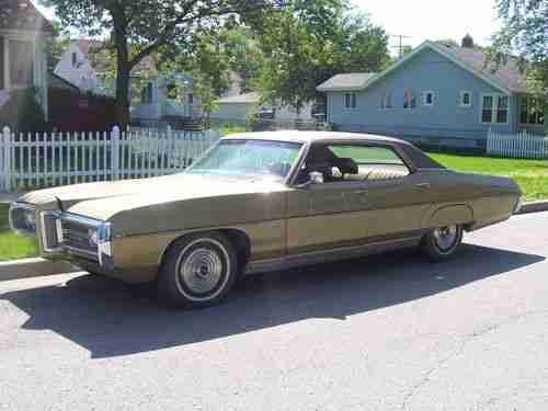 1969 PONTIAC BONNEVILLE ,4 DOOR HARDTOP.OKLAHOMA CAR.NO RUST.CAR WAS A BARN FIND IN 2011.WAS PAINTED AND PUT AWAY FOR ABOUT 35 YEARS,BUT WAS STARTED 4 TIMES A YEAR.I DROVE IT HOME.6 MILES.NEW PARTS AND WORK DONE :NEW VINYL TOP,TIRES,BATTERY,DUAL EXHAUST WITH FLO MASTERS,COMPLETE BRAKE JOB ,(NEW CALIPERS,HOSES,PADS,ROTORS,DRUMS,WHEEL CYLINDERS,SHOES,AND BRAKE HARDWARE),COMPLETE TUNE UP,REBUILT CARB,TRANS SERVICE AND OIL CHANGE.NEAR PERFECT ORIGINAL INTERIOR.THIS CAR IS MY DAILY DRIVE.FLOATS DOWN THE HIGHWAY AT 80 ALL DAY LONG.OPTIONS ARE PS,PB,AC,AM RADIO TRUNK RELEASE,BUICK MAGS,AND CLOTH INTERIOR.WOULD DRIVE THIS CAR ANY WHERE.ANY QUESTIONS CALL LEE AT 219-230-7364.WILL NOT SHIP.NO CALLS AFTER 9 :PM.THANKS FOR LOOKING AND GOD BLESS.