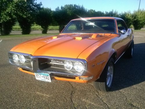 1968 pontiac firebird 400. special order orange Paint code, very rare - - - paint is the code on the data plate. 4 speed muncie. Floor console, power steering, 400 cubic engine, also has hood mounted tachometer, am radio, rear antennae , wood wheel, GM long branch exhaust manifolds. Black bucket seat interior.american racing wheels. this car was treated to a complete rotissorie restoration. The Original ORANGE gas tank door, in the original paint, was signed by the Arnie Beswick. He is a legendary Pontiac racer. This car was sold new in Los Angeles. CA. Jules Meyers pontiac. Arnie also had raced for jules meyers with his orange tiger car back in the sixties. Only a few cars where produced like this,called experiments or promotional cars . This was before the debut of the 69 judge c-r. Is darker orange color than this one. This car was parked since 1974. Have access to the four 1968 JC code rally 2 rims as well. I have had the car for over 15 years. Most all of the work is done. I drive it rarely to local shows only. can let go of the wheel at 60 mph, like it did when new. the engine 68 400 was rebuilt all stock with the 068 s cam standard bore and crank. rebuilt muncie 4 speed, rebuilt posi rear end. new mounts , pretty much everything. bumpers, grilles, huge list of parts replaced. fuel tank, all fuel and brake lines, brakes, new springs front and rear shocks, sway bars now is 1 1/8 up front. new hi tech sound deadener mat under the new black carpet, new exhaust 2.5 inch aluminized with flow master mufflers. and tips. interior was replaced, original front door panels. Have the rare bird glass up front, another real rare option. all other glass and trim is new, car was optioned with the 3.36 ratio rear end. Also has the factory adjustable dual traction bars. The under side looks incredible, no rust or floor patches.Also installed nos emblems and lenses on car. correct hurst shifter with rounded chrome handle. Not a car to easily want to part with. or find another like it again. selling in as is condition, I can be reached at 651-335-8534. May request the option to end auction early if sold locally. thanks