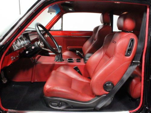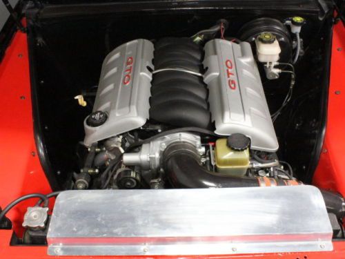 The red leather interior was plucked from a 2006 GTO, including the leather bucket seats that offer about ten zillion adjustments so it's easy to get comfortable. They're also heavily bolstered for the kind of performance this car can deliver, and they were seamlessly blended into the early car's interior. A tilt column holds a 3-spoke steering wheel that frames a full array of Auto Meter gauges in a shiny billet panel that looks old but is brand new. A fabricated center console holds the GTO's 6-speed shifter as well as the Pioneer touch-screen entertainment/navigation system, controls for the A/C, and a pair of cup holders that are surprisingly useful. New black carpets recall the original design, and you'll note that the door panels were custom made to eliminate the window cranks, as this car now has power windows. The trunk is also expertly upholstered with simple gray fabric and you can easily see the mini tubs that were installed to handle the oversized meats underneath.