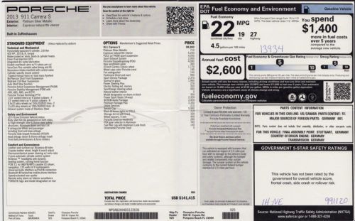 Always Keep inside the Garage. Have Almost all Porsche Options factory installed !! Also have an Escort Radar Passport 9500ci with Smart Cord Installed !! Gorgeous combination Exterior Platinum Silver / Espresso Natural Leather Full Leather Interior Porsche Dynamic Chassis Control with Porsche Active Suspension Management Sport Suspension Sport Exhaust System PDK Transmission Rear Windshield Wiper Fire Extinguisher ParkAssist Front & Rear Sport Chrono Package Sunroof in Glass Power Steering Plus Electric Folding Exterior Mirrors SportDesign Steering Wheels Model Designation on Doors in Black Power Sport Seat (14 Way) with Porsche Crest on Headrest Bose Audio Package Premium Package Plus Online Services Aerokit Cup Black Bi-Xenon lights with Porsche Dynamic Light System Storage Bin LID with Porsche Crest Wheel Spacers 5mm PDK Gear Selector in Aluminum Fuel Filler Cap with Aluminum Look |