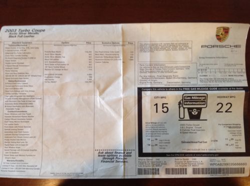 2003 Porsche 911/966 Turbo Coupe Excellent condition... Interior/Exterior 2003 Porsche 911 Turbo continues a performance legend begun when the first 911 Turbo was introduced to North America in 1976. With a 415-horsepower (SAE) twin-turbo engine and advanced all-wheel drive, this 2003 911 Turbo takes its place in the top echelon of the supercar category. Derived from the Porsche GT1 racecar, the 3.6-liter, horizontally opposed six-cylinder engine sustains 415 lb.-ft. of peak torque from 2,700-4,600 rpm. Trans- standard 6-speed manual transmission. This 911 Turbo can accelerate from 0-62 mph (0-100 kph) in just 4.2 seconds. top speed of 189 mph (305 km/h). I only had the balls to take it about 168mph. Once Enhancement performance programing package increases the twin-turbo engine’s output to 444 horsepower (SAE) and 457 lb.-ft of torque. Cost $2,600.00 Porsche Stability Management system (PSM) can detect a loss of grip at the front or rear and reduce instability by applying braking to individual wheels and, if necessary, altering engine power. The upper part of the two-piece rear stabilizer wing automatically rises at speeds above 75 mph (120 kph) and lowers at speeds below 50 mph (80 km/h). But I have it fixed in the up position....... aluminum RENNWORX BLACKED OUT-spoke alloy wheels measure 19 x 8 inches in front and mount HANCOCK VENTUE V2 EVO 225/40 ZR19 tires; 19x 11-inch rear wheels mount HANCOCK VENTURE V12 EVO 305/30 ZR19 tires. ALSO HAVE THE OEM 17" SET OF TIRES AND RIMS. Standard Bi-Xenon headlight clusters feature xenon high-intensity discharge headlights for both the low and high beams. Tinted windows Black on Black. I'm the 3rd owner. Garaged |