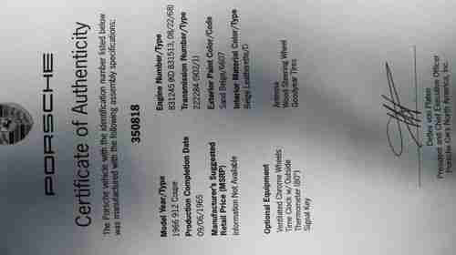 This 912 Porsche was an early model with several distinguishing features found on the early cars. It has the early flat closure panel for the engine deck lid and a 5 speed transmission as standard equipment. The four speed transmission was not yet available. It was ordered with 5 gauges and was completed September 6th,1965. Upon entering the United States, it was titled as a 1966 model year.