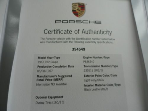I HAVE A 1967 PORSCHE 912 COUPE WITH A NON RUNING 912 ENGINE NON NUMBER MATCHING... HAVE NOT TRYED TO START THE CAR, BARN FIND ... THE CAR HAS SOME RUST IN THE BOTTOM IN THE FRONT BY THE A ARMS AND FRONT SPAIR... THE MAIN FLOOR BY THE SEATS LOOKS SOLID BUT ONE SMALL HOLE AND REAR TAIL ARMS MOUNTS ARE GOOD.... THIS CAR WAS LIGHT IVORY / 6604 BODY COLOR AND BLACK LEATHERETTE/B INTERIOR.... THE CAR HAS METAL FLAIRS ON IT ADD ON IN THE PAST... DOES NOT HAVE FRONT AND REAR GLASS..... ONE DOOR GLASS BROKE.....WHAT YOU SEE IN THE PICTURES YOU GET NO OTHER PARTS... HAS SOME RUST ON THE BODY SPOTTY... CAR IS AS-IS... HAVE CLEAN TITLE WOULD MAKE A GREAT PARTS CAR OR FULL RESTO... YOU MUST FIND A SHIPPER I WILL HELP LOAD.... I WILL SEND PORSCHE LETTER OF AUTHENTICITY WITH CAR... THIS IS THE CHEAPEST WAY TO OWN ONE OF THESE VERY COLLECTED PORSCHE 912 CARS.... NO RESERVE AUCTION !! START BID $500 !!! REAL AUCTION NO BUY IT NOW PRICE !!
