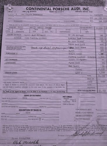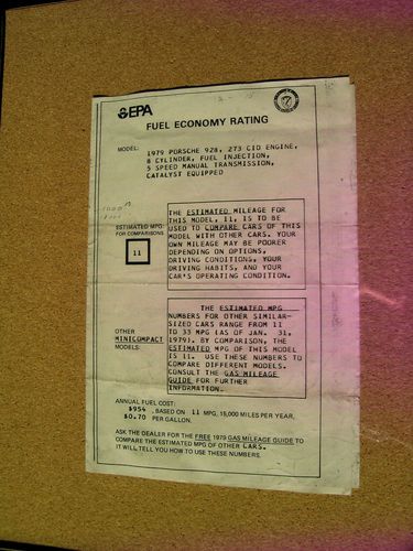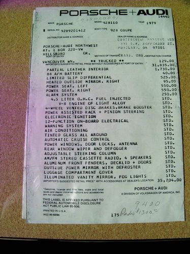Due to medical reasons we are going to offer this Porsche for auction and hope that someone will enjoy driving it the way it should be driven. Our mechanic's been nagging us to "take it out on the road and drive it", but we are not able to do that anymore. The alarm system needs to be reconnected; the passenger door automatic lock needs to be adjusted; the dash lights are touchy inside and should be looked at. The air conditioner needs regular servicing in 2013. The Berlin Blaupunkt radio ($1,300)was added when the car was purchased and she had automatic transmission instead of a manual. Please read the detail items on the photo of the original window sticker on this car. Take a close look at the Annual Fuel Cost information if you want an "oh no" moment. By the way, we get better than 11 mpg and always use Premium Chevron gas.