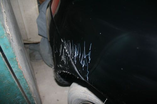 Teeth marks in right rear behind wheel. 180lb dog chewed there. She put dog in garage and I never do. He was hungry and tried to eat car as appetizer. He had heartburn for a week after.
