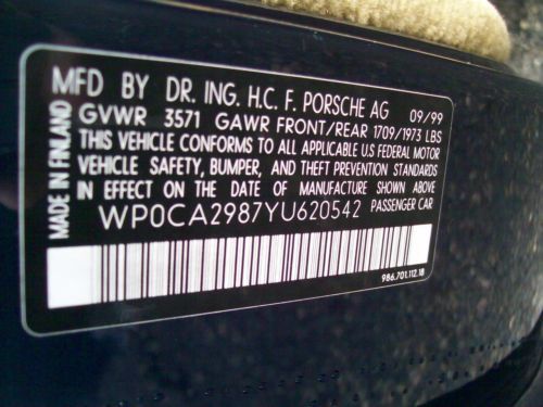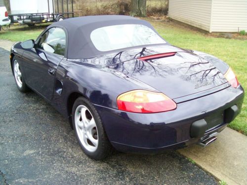 LIKE NEW,MINT CONDITION,1 OWNER 2000 PORSCHE BOXSTER CONVERTIBLE.AUTOMOBILE IS IMMACULATE INSIDE AND OUT,AND HAS BEEN RELIGIOUSLY MAINTAINED BY THE DEALER.AUTOMOBILE HAS JUST HAD THE 90K MAJOR SERVICE DONE IN SEPTEMBER OF 2013.CAR IS ALL ORIGINAL,PURCHASED DIRECTLY FROM THE OWNER BY OURSELVES.PAINT IS ALL ORIGINAL,BEING DRIVEN ONLY IN THE BEST OF CONDITIONS.TIRES ARE CONTINENTAL,WITH MORE THAN 75% TREADLIFE REMAINING.ALL 4 WHEELS ARE UNCURBED AND IN LIKE NEW CONDITION.INTERIOR IS IMMACULATE WITH VERY LITTLE EVERYDAY WEAR AND TEAR.POWER SOFTTOP IS IN NEW CONDITION,NO RIPS OR TEARS,AND A CLEAN,CLEAR PLASTIC REAR WINDOW.AUTOMOBILE RIDES AND DRIVES PERFECTLY,AND EVERYTHING WORKS AS IT SHOULD.ONE OF A KIND AUTOMOBILE,AT AN AFFORDABLE PRICE.PLEASE PHONE DAVE CENTER AT 513-608-3906 WITH ANY AND ALL QUESTIONS. A NON REFUNDABLE $500 DEPOSIT IS REQUIRED WITHIN 48 HOURS OF AUCTION END THROUGH PAY PAL.THERE IS A $250.00 DOC FEE TO BE PAID ON ALL TRANSACTIONS.THIRTY DAY TEMP.TAGS ARE AVAILABLE FOR AN ADDITIONAL $18.50.PER OHIO LAW I MUST TRANSFER TITLE TO BUYERS NAME.ALL OHIO ARIZONA,CALIFORNIA,FLORIDA,INDIANA,MASSACHUSETTS,MICHIGAN,SOUTH CAROLINA RESIDENTS ARE REQUIRED TO PAY SALES TAX ON DELIVERY.ALL VEHICLES ARE SOLD "AS IS".LOCAL PICK-UP ONLY.LOCAL PICK-UP OR SHIPPING IS THE SOLE RESPONSIBILTY OF THE BUYER. |