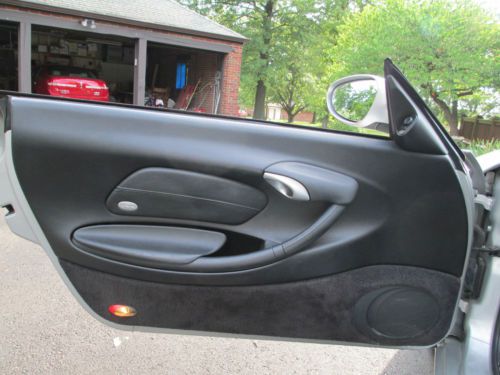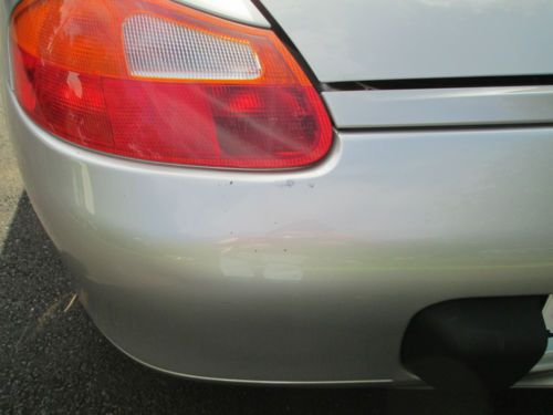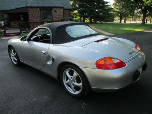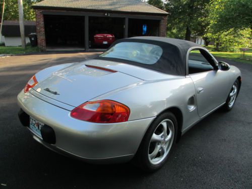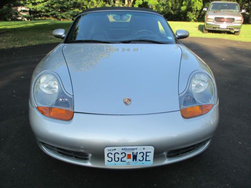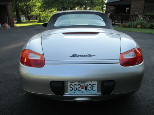 Silver with black interior and top. This car is in Extraordinarily Excellent Condition. 48,000 Original Miles This car is originally from Texas and has always been babied and garaged. The top and back window are original and they are Like New. This is one of the nicest Boxsters you will find in this price range with these low miles. I am only the second owner and have had the car for about 4 years and put only a few thousand miles. I had a professional Porsche mechanic perform a full inspection and complete tuneup including one new coil pack upon purchase. The car runs and drives excellent and everything works as it should. The rear tires are new and the fronts have 70 to 80 percent rubber remaining. (pictured is one front and one rear tire) Comes with front bumper, hood and side mirror covers with storage bag. (pictured installed) I also have the original owners manuals and cover that live behind the passenger seat. The body and interior are in exceptionally excellent condition with the exception of only few flaws. (listed below) The left rear bumper has two large chips and more small chips below the left tail light (pictured). Their are also some very small spots on the trunk lid and top of quarter panel (left side). The passenger front fender has a chip/scratch near the door (pictured) There is a 3/4" long scratch on the lower passenger rear rocker panel. The front bumper has some very mild scuffing on the belly (pictured). The hood has only a handful of tiny rock chips. The passenger side plastic vanity mirror cover hinge is broken. (still have it). The center console has some scuffing from the seat belts because they move with the seat. Other than these flaws there are only a few very minor chips and scratches. This car needs absolutely nothing, it has been fully maintained and is ready to drive and enjoy. I selling because I desire a 1955 Plymouth and will consider trade for a nice 2 door hard top or convertible. Thanks for looking. Buyer is responsible for all shipping costs and arrangements, although I will be happy to assist in any way that I can. Please note that all payments must absolutely clear my bank before I can release the car or title. I will accept Cash, Bank wire transfer or Bank Check. Please feel free to call and make an appointment to inspect the car. I'm old school so if you have any questions please call me. Thank you, Jim, 314-four87-6273 (Please no calls after 9:30 PM or before 8:00 AM) Please I do NOT need any help selling my car. |