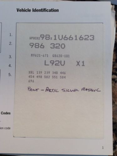This car is mechanically and cosmetically in showroom condition. Just 24k miles from new. It is becoming more difficult to find original, low mileage 986S cars in this condition. I am the 4th owner- Originally delivered to Davenport, IA it made its way to Long Island where I purchased the car and had it in CT for a couple of years before transporting it to GA. The car has passed through the hands of several caretakers/Porsche enthusiasts keeping the car stock, driven and well maintained. Clean Carfax and clear title. This car needs nothing other than to be enjoyed by the next owner. Exterior Description: -Arctic silver, paint code L92U -Color matching bumper plugs included (bumperplugs.com) -18" GT3 design wheels -Bridgestone Potenza Pole Position tires with 95% tread -Resprayed front bumper in 2011 to repair minor rock chips Top/Interior Description: -Black partial leather -Original black top in perfect condition -Rear plastic window is clear, no clouding or cracking -Lexan wind deflector in perfect condition -Original CDR220 radio, single CD player -Cold weather package, heated seats Mechanical Description: -LN Engineering IMS dual bearing upgrade -New Rear Main Seal -Resealed left and right camshaft covers -All work and maintenance performed by Musante Motorsports in Windsor, CT in 2012 (musantemotorsports.com) -New Autocraft Gold battery Included Parts/Accessories: -Black and gray coco mats (cocomats.com) -Tailored fit indoor "Noah" California Car Cover (calcarcover.com) -Original books and manuals -Binder of additional receipts and paperwork -Wind deflector clips -Paint matched touch up kit -Replica German plate, bracket -Porsche flag |