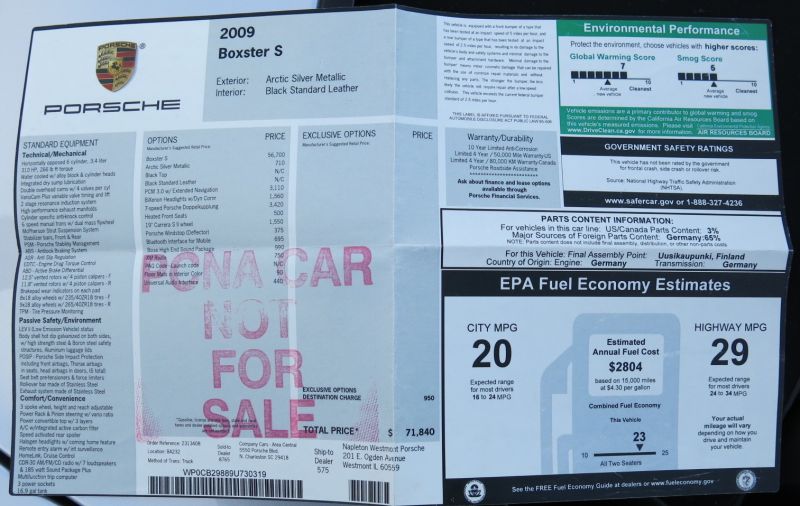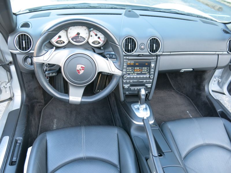 2009 Porsche Boxster S (VIN: WP0CB29889U730319), arctic silver met. / black leather and carpeting black conv. top, 25,800 original miles, PDK 7-spd. trans., 3.4L horizontally opposed 24V DOHC 6 cyl. engine with VarioCam Plus, 310 hp., water cooled heads, 4-wheel cross-drilled disc brakes with ABS, red brake calipers, active brake differential (ABD), traction control (ASR), Porsche Stability Management (PSM), independent front and rear suspension, Options: special paint, PCM 3.0 w/ extended NAV, bi-Xenon headlights with Dynamic cornering, PDK trans, heated seats, 19” Carrera II rims, removable wind deflector, Bluetooth phone and audio interface, BOSE premium sound with digital sound and sat radio, PAG launch code (factory Porsche exec car when new), floor mats in interior color, auto climate control, power folding convertible top, roll hops with removable wind deflectors, factory alarm system, (2 keys & 2 remotes), 2 owners since new, books, manuals and window sticker, very good service history, carpeting and leather are excellent, paint is virtually flawless, windshield and convertible top are both as-new, never smoked in, clean CarFax report, new MSRP of $71,840.00, just serviced at Porsche dealer 1.000 miles ago, offered at $32,750.00 / best offer. Call or text Brian @ (812) 760-5513 - located in Evansville, IN 47715.