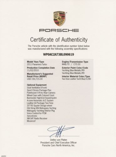 A ONE OWNER PERFECT 2011 PORSCHE PANAMERA TURBO.OPTIONS INCLUDE: SEAT VENTILATION,SPORT CHRONO PACKAGE PLUS,PARK ASSISIT F/R INC CAMERA,WHEELS CAPS WITH COLORED CREST,BURNESTER HIGH-END SOUND SYSYTEM,4 ZONE AUTO A/C,LEATHER INTERIOR PKG TWO-TONE,20" SPYDER DESIGN WHEELS,HTD STEERING WHEEL MAHOGANY YACHTING,MAHOGANY YACHTING INTERIOR PKG,VOICE CONTROL FOR PCM,SERVOTRONIC,XM SAT RADIO,MOONROOF.