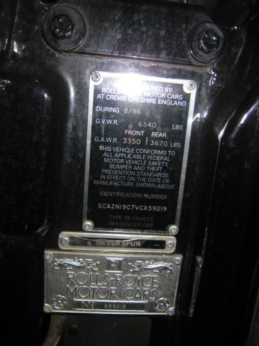 We have for sale a 1997 Rolls Royce Silver Spur. This car is a beauty! 1997 was the next to last year of this classic body style. It includes a 6.75 liter turbocharged V-8. Very strong running and fast! It is a beautiful black color with black leather interior. The black leather has a red piping accent. The body is in good shape and the engine is very clean. The mileage is original. The tires are Michelins and are in great shape. We have owned the car for a little over 8 years and only put about 5000 miles on it. We are the third owner of this car. The car has been stored in a climate controlled garage and started/maintained regularly . The only real thing wrong with the car is the suspension system. It is a hydraulic system and will require some work. It doesn't provide a smooth ride but it is something that can be fixed. This is the reason we are selling it at such a discount. Originally this car sold for over $215,000.00. This is a must see to appreciate. Vehicle is sold as is with no warranty. Payment is by bank wire transfer only. Buyer to arrange and pay shipping fees.