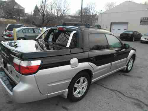 Up for sale a 2003 Subaru Baja THIS VEHICLE IS A PENNSYLVANIA SALVAGE TITLE CHECK YOUR DMV ON REGISTERING A SALVAGE VEHICLE. this car is very clean in and out the body other than the dammage is very well kept no dents or scrathes only a small mark on rear bumper see picture the three wheels are in excelent shape and have matching cooper tires that are about 3/4 tread left. the car will need a fender hood front bumper cover headlight fog light and some work on the upper apron the frame is straight the suspension is good car runs and drives good.. there is no dammage on the door and no bags deployed THE ABS LIGHT IS ON NO OTHER LIGHTS ON. we installed a new battery so car starts on its own power. the interior is very nice and clean it has two tone black and grey leather on the doors seats steering wheel. the factory mats are still in it there is no burns tears or rips in the interior. the drivers front seat has a small seperation where the black meets the grey insert not torn the stitching has failed. easy fix and not noticable to you push them apart. this car has alot of options and good miles it has the factory sunroof also. the motor sounds good no smoke or noises. it also has the hard cover on the bed painted to match and the key is included. thank you for looking ask all questions before offering