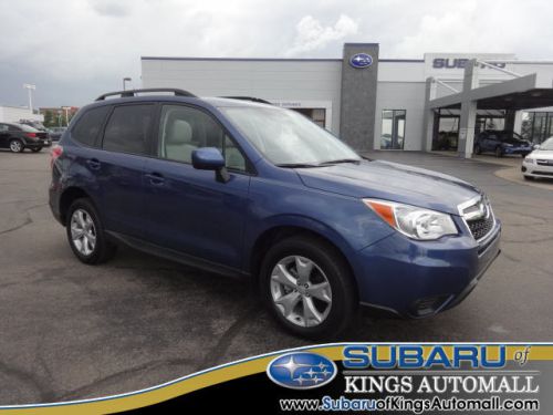 Subaru Stellar Care Award Recipient for outstanding customer service and satisfaction.Subaru of Kings Automall proudly presents this 2014 Subaru FORESTER 4dr Auto 2.5i Premium. Represented in BLUE. Fuel Efficiency comes in at 32 highway and 24 city. Under the hood you will find the 2.5 coupled with the CVT. The Word Around Town: The Subaru Forester has always been a very nice compromise between the practicality of a small hatchback or station wagon and the capabilities of an SUV. Though it can't off-road like some of the more serious SUVs out there, the Forester does at least come standard with all-wheel-drive, unlike most of its competition. Though base model Foresters perform similarly to competitors from Ford and Mazda, turbocharged versions offers significantly more power, resulting in sprightly performance. On-road handling is also a step above what is generally offered in this segment. The Forester starts at just under $22,000. Options and Safety Features: Nicely equipped with ABS And Driveline Traction Control, Airbag Occupancy Sensor, Curtain 1st And 2nd Row Airbags, Driver Knee Airbag, Dual Stage Driver And Passenger Front Airbags, Dual Stage Driver And Passenger Seat-Mounted Side Airbags, Electronic Stability Control (ESC), Low Tire Pressure Warning, Outboard Front Lap And Shoulder Safety Belts -inc: Rear Center 3 Point, Height Adjusters and Pretensioners, Rear Camera, Rear Child Safety Locks, Side Impact Beams. Awards And Accolades: IIHS Top Safety Pick, Top Safety Pick+, Top Safety Pick+ Motor Trend Automobiles of the year Thank you for taking the time to view this vehicle. Please contact us at 888-210-8460 to discuss any questions you may have about this vehicle or to set up a test drive. We are conveniently located in the Kings Automall and are open 7 days a week. All Subaru's sold at Subaru of Kings Automall come with free complimentary oil and filter changes for as long as you own the vehicle. BEFORE YOU COME TO THE LOT TO LOOK AT A PARTICULAR VEHICLE, GIVE JEREMY VASKE A CALL @ 888-210-8460. THIS WILL ENSURE THAT THE VEHICLE IS HERE ON THE LOT AND READY TO SELL. WE ALWAYS TRY TO ENSURE THAT ALL INFORMATION ON THE VEHICLE ARE ACCURATE. PLEASE ASK TO SEE THE CARFAX ON THE VEHICLE THAT YOU ARE INTERESTED IN. THANK YOU FOR VISITING OUR VEHICLES AND HAVE A GREAT DAY.