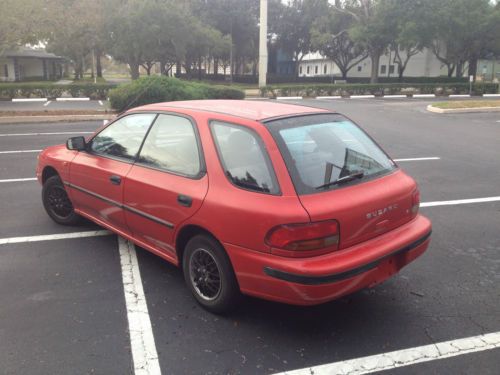 You are viewing a 1993 Sport Red Subaru Impreza station Wagon. You can get in this car and drive away today. I have the title in hand. She may not be a Bugatti, but what she lacks in looks she makes up for it with practicality and reliability. Did I mention shes cost effective as well? All services are up to date she will need an oil change in 1000 miles. The a/c blows hard and cold no issues there. Any questions let me know.