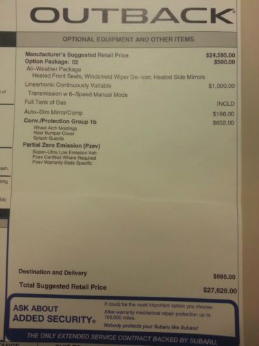 2010 Subaru Outback 2.5i Premium Wagon 4-Door 2.5LAll Weather Package Heated Seats, and De-Icers), Convenience/Protection Group 1 Owner, No Accidents, very clean car. New front brakes (rotors and pads). Scratches on hood and small dent on pass. fender - see pics. Title is clear but awaiting PA Dept. of Transportation to send Title. PennDOT says 6 to 10 business days. Deposit will not be due until the title delivered. Pickup only, $500.00 due at end of auction and PA title is in my possession, Balance due in cash at pickup Seller reserves the right to end the auction early. |