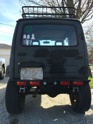 This is a good little off road beast but it is far from perfect. I'll do my best to be up front with all known issues, just keep in mind that this is a 1988 off road vehicle and was used as such. It does have some rust and dents and oil leaks. The worst of the dents is in the drivers side rocker where a deer thought he had the right of way. The drivers seat has some tears in it and the tach don't work because of the MSD ignition but I do have an after market one that goes with it, you have to install it. This vehicle has been highly modified and I'll try to list them all. The engine is the stock 1.3, the head has been rebuilt and a new isky cam was installed less than 1000 miles ago. It has a new header with full exhaust. New 8mm plug wires and MSD ignition and coil, 105 amp GM alternator, Harley Davidson CV carb with custom built intake (it does start good in cold weather). It does need a pan gasket and I'm gonna try to do that in the next few days. It's been lifted about 8 inches or so and has 4.57 gears in both diffs and rides on 33 X 16 tires. Spidertrax 1 inch wheel spacers, trail tough shackles in the rear, BMW high steer mod, and Zor "Snatch" t-case mount. It has the doorless mod and has grenade door handles and shifter knobs. It has new aftermarket bumpers front and rear with l.e.d lights, Bushwacker 6 inch flares, roof rack with 100 watt lights and a hi-lift jack mounted on the front bumper. Inside it has diamond plate panels, 5 way harnesses, Tracker steering wheel, and an aftermarket stereo with aux input. I also have various parts that go with it, extra t-case, tranny,rear diff with 4.57 gears, mini spool and 1.6 Tracker engine. The odometer is showing 16371 miles but i know its been turned over. The title is clear. I will not ship this vehicle, you'll have to come get it. 500.00 deposit within 48 hours through paypal and balance to be paid in cash or through paypal.