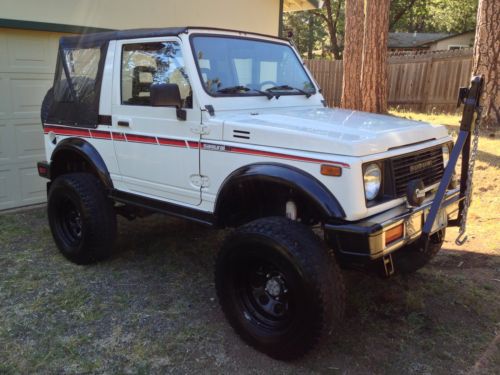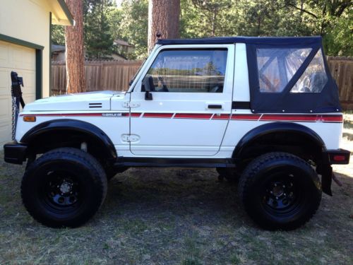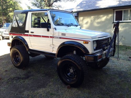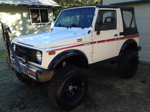 Up for bidding / sale my very well cared for 1987 Suzuki samurai jx 4x4 . This Suzuki is in extremely good shape from inside and out and was only used during the summer months as a tow behind vehicle behind the motorhome. Has always been stored indoors so the exterior and interior are in amazing condition !!! Without a question one of the nicest samurais I have ever seen , I would consider this a time capsule considering its 100 %rust free and a must see to fully appreciate . Has 81,000 original miles , 2nd owner vehicle and is Accident free and a Clean California title in hand . Was used only as a tow vehicle so most miles are from being flat towed across the states. Comes with removable tow bar so you can tow this Suzuki samurai with you anywhere you would like. These make excellent tow behind vehicles since they are so light yet solid and simple vehicles that can go just about anywhere. Never abused off road but was professionally built with a list of brand new parts from Calmini.com . The 4x4 works great and engages and disengages without a hitch . This is mechanically sound to say the least and does not need a thing . This is ready to drive with peace of mind. No leaks or problems of any kind. Runs with the best of them !!! Drive train is quiet and the clutch and transmission shift smoothly . Starts up right away and idles at 800 rpm very smoothly . Just passed smog as well.
