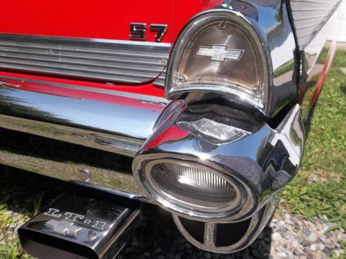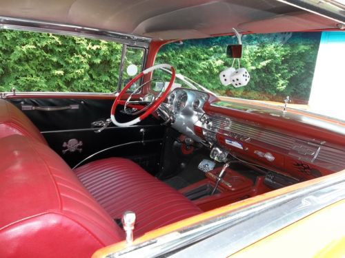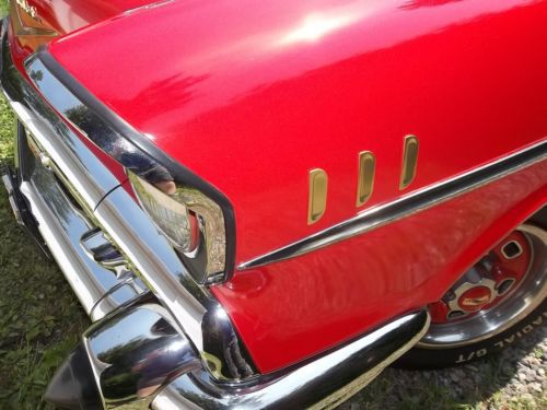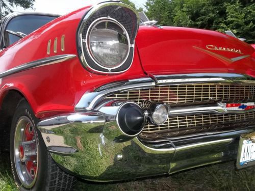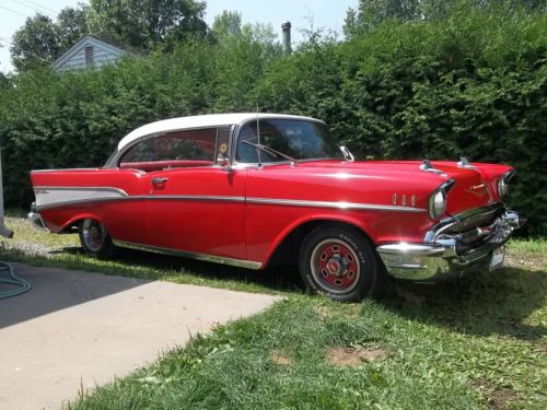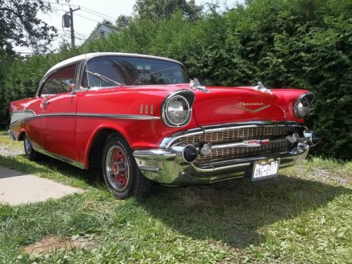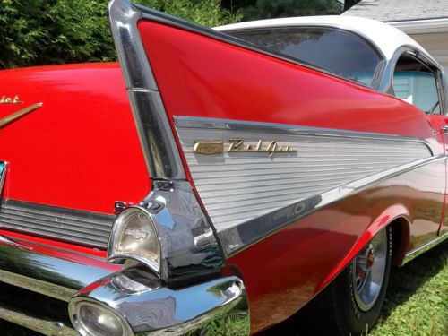 hello up for auction is my beautiful classic 1957 chevy bel air 2 door sport coupe. originally it was pink and white with black and silver interior and a straight 6 engine. this beauty now has a nice red and white classic looking paint job on a very solid original bodied car. the paint job is older and was done by my father in his shop it looks very nice on the street and even gets some trophies at the show but is not flawless.was taken down to bare metal. this is a nicely restored driver not a trailer queen. the car now has a newly rebuilt powerfull 350 chevy 4 bolt main small block bored .030 over and crankshaft.010 under with edelbrock aluminum intake,cam kit,timing chain set and 4bbl carb. new high torque starter and alernator. custom twin ram cold air intake breather system. brand new summit racing heavy duty TH 350TRANSMISSION RATED TO HANDLE 400 PLUS HORSEPOWER with new stall converter and flexplate and transmission cooler. billet specialties valve covers,new radiator with overflow catch can,dress up oil pan,intermittent wipers from newport engineering,new dual master cylinder with speedway adjustable proportioning valve. for the new front disc brake conversion kit. the original; rear brakes have been fully rebuilt. the rear end has been fully rebuilt, the car also has front and rear addco swaybar kits with poly bushings, car has been lowered approx. 2 1/2 inches all around with new lowering coils in front and lowering leaf springs in the rear. the car has new shocks all around the rear one have been relocated on a suspension brace for tire fitment options.it has full front end rebuild kit installed that includes new tie rods and a frames. she also has a new power steering kit installed that included the right pump,brackets and steering box that is mated to a new chrome ididit tilt column. the interior is nice and clean with red channel quilt tuck and roll seats, restored original steering wheel with new chrome horn ring and emblem. the dash is painted red with a polished billet insert the interior has many little personalized touches including a third brake light and red sony explod speakers the front ones are mounted low in kick panel pods. the trunk has a full size spare tire and wheel with a cover and a bumperjack. in the trunk is a subwooferbox that can go with the car or we can remove it and sell the car a little cheaper.same goes for the cd changer and cd player. which are mounted under the dash the original dash is not cut incase new owner wants to go back to original. the exterior stainless is in presentable condition overall but hasnt been restored please see pics.THE NEW DRIVETRAIN AND BRAKES ONLY HAVE APROX. 300 MILES ON THEM. MOST IF NOT ALL EXTERIOR CHROME HAS BEEN REDONE OR REPLACED THESE PEICES INCLUDE: NEW REAR BUMPER AND TAILLIGHT HOUSINGS AND BUMPER ENDS WITH ACSESSORY BACK UP LAMPS, NEW VEES AND SCRIPTS,GOLD FENDER HASH MARKS,NEW 3 PIECE HOOD BARS,FRONT BUMPER AND ENDS AND BULLETS,NEW GRILLE,GRILLE BAR EMBLEM AND SIGNAL LAMPS. NEW MIRRORS,HOOD ROCKETS,NEW ANTENNA AND BASE, NEW CHROME DOOR HANDLES AND GUARDS,AND WIPER ESCHUCHEONS. AND NEW ROCKER PANEL TRIM STRIPS AND LOWER EXTERIOR TRUNK TRIM PANELS. CAR HAS A NEW GASTANK, NEW DUAL EXHAUST WITH CORVETTE LT1 MUFFLERS AND STAINLESS TIPS. ALL GLASS IS GOOD. WINDSHEILD IS NEW. CAR HAS CAMARO COLOR MATCHED RALLY SPORT WHEELS WITH TRIM RINGS AND CENTER CAPS THAT NOW HAVE BELAIR EMBLEMS AND GOOD WHITE LETTER TIRES WITH APROX. 2000 MILES ON THEM. THIS 57 ALSO HAS CLEAR EURO TAIL LENSES WITH RED LED BULBS. AND STREET GLOW UNDER BODY NEON KIT FEATURING 4 LARGE RED TUBES. I AM SURE I MIGHT BE FORGETING SOMETHING SO IF YOU HAVE QUESTIONS DONT BE SHY. OVERALL THIS CAR IS VERY CLEAN AND A BLAST TO TAKE OUT AND CRUISE IN STYLE AND COMFORT. SHE IS RELIABLE AND DRIVES STOPS AND HANDLES NICE. IT GETS PLENTY OF ATTENTION EVERYWHERE IT GOES!!!!! THE BAD ABOUT THE CAR THE SIDE GLASS WINDOW FRAMES LOOK DULL AND HAVE SOME PITTING I NEVER BOTHERED TO REPLACE THEM BECAUSE I ALWAYS KEPT THEM ROLLED DOWN BECAUSE THE CAR ONLY COMES OUT OF THE INSULATED GARAGE ON NICE DAYS. THE CAR NEEDS OF A COUPLE OF SMALL WEATHER STRIP PEICES TO BE REPLACED. THE CAR IS LICENSED ,REGISTERED AND HAS CLASSIC AGREED INSURANCE AND JUST PASSED NEW YORK STATE INSPECTION WHEN IT CAME BACK FROM INSPECTION THE TURN SIGNALS WORK "NOW AND THEN" THEY WORKED FINE BEFORE IT WENT IN I KNOW BECAUSE I CHECKED THEM. THIS IS SOMETHING I WILL TRY TO FIX BEFORE SALE I ALREADY ORDERED THE SUSPECT REPLACEMENT RELAY. THESE ARENT HUGE MAKE OR BREAK ITEMS I JUST WANTED TO BE SURE AND MENTION THEM. PLEASE CHECK MY FEEDBACK AND BID WITH CONFIDENSE. THE CAR WILL BE PAYED IN FULL AND PAYMENT SECURED BEFORE IT LEAVES MY PROPERTY. IM NOT NEW TO THIS SO SCAMMERS SAVE YOUR TIME. IF ANYONE SERIOUS ABOUT THE CAR WOULD LIKE TO VEIW IT LET ME KNOW AND I WILL SET UP A TIME THAT IS CONVEINIENT FOR YOU. ONCE CAR IS PAID FOR I CAN STORE IT FOR A REASONABLE AMOUNT OF TIME...7-14 DAYS. THANKS FOR LOOKING.