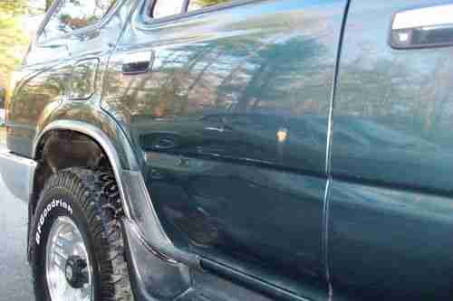 The Good: A lot good about this truck. I bought it at roughly 142K. Since purchase I have: done complete timing belt and water pump job with tensioner, etc., replaced washer pumps, wipers, complete tune up minus fuel filter, new front rotors and pads, flushed entire brake hydraulics, all new BF Goodrich All Terrain T/A TKO tires, new rear shoes come with it, replaced the knock sensor and wiring with new shielded wiring so there will never be an issue with knock sensors. It has one mounted in the lift hook, and a new unit in the block with the pigtail all ready. Currently the one in the lift hook is connected. Air meter has been re-clocked to reduce factory rich condition. EVERYTHING works in this truck except for the rear defroster. All else, works, the cruise, all windows, 4X4, lights, locks, keyless entry, AC has a new compressor and charge and blows ice cold, roof works smooth, engine runs excellent, good oil pressure, coolant temp., muffler/tailpipe was replaced at purchase, Aux. lights are Hella 500s and Blazer Explorer fogs, both actuated with illuminated switches at left knee panel and slaved to the low and high beams through relays. Sound system still sounds very good, power antenna works, truck drives quietly, with no clunks or issues, steering column seal was also replaced. Front CV axles replaced. Chassis is in good shape with no apparent rust at frame rails or other structures. there is some typical surface rust underneath as shown. All gauges work, all indicators, and the 4X4 light come on as they should. All roof racks intact and moveable. Truck has a good inspection until 11/13.