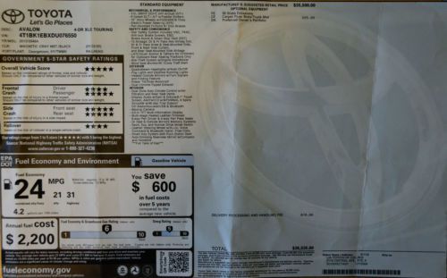 The Avalon comes loaded with about every feature you could ask for as standard equipment. It is only 8 months old, so you have the balance of the warranty (Toyota standard 3yr/36k) left as well as the remainder of the 2yr/25k ToyotaCare package, which covers routine maintenance. We are still paying for the car (i.e. there is a lien on it), but New York State law allows a title with a lien to be transferred to a new owner before the lien is released. There is some paperwork involved, but it is fairly straightforward. While I've bought and sold a few things over the years on eBay, this is the first time I've tried to sell a car. I want you to know exactly what you are getting before you place a bid, so if you have any questions please let us know! We are more than willing to take additional pictures if there is something in particular you'd like to see, or talk with you either through email or on the phone at 203-392-4382. If you are looking for an almost new car with all the bells and whistles then this is THE one for you! |