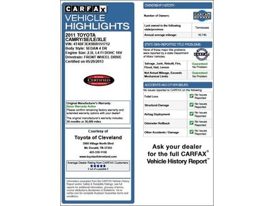 11 Xle Certified 2.5l Moon Roof Leather Premium Sound Alum. Wheels One Owner Toc on 2040-cars