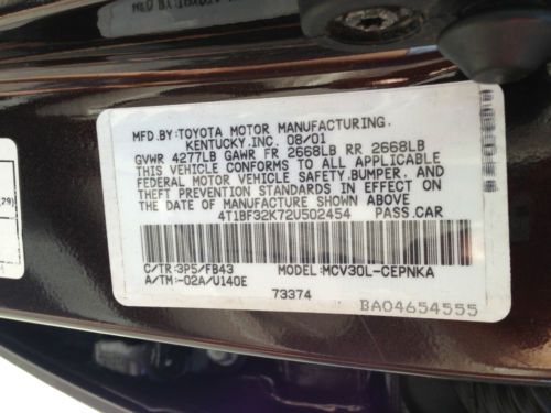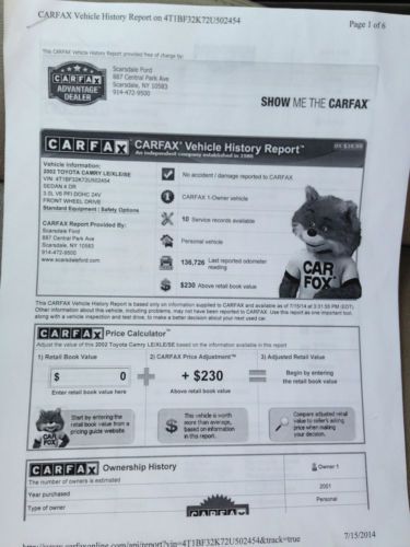 THIS 2002 TOYOTA CAMRY LE IS READY FOR YOU. 1 OWNER. CARFAX AVAILABLE POWERED BY A 3.0L 6 CYLINDER ENGINE, AND MATED WITH AN AUTOMATIC TRANSMISSION IS IN GREAT SHAPE. JUST 136K MILES ON IT. POWER LOCKS, POWER WINDOWS, POWER SEATS, KEYLESS ENTRY WITH ALARM. IT DRIVES BEAUTIFULLY WITH NO HESITATIONS AND HANDLES SMOOTHLY AS YOU DRIVE DOWN THE ROAD. HAVE NEVER BEEN IN ACCIDENT. NEW FRONT BRAKE PADS AND ROTORS, NEW FRONT AND REAR STABILIZER LINKS AND BUSHINGS. NO CHECK ENGINE OR MAINTENANCE LIGHTS ON, MEANS THAT YOU CAN HOP IN AND DRIVE IT ANYWHERE. THERE ARE NO MAJOR BLEMISHES WITH THIS CAMRY, JUST SOME SCRATCHES AND DINGS. WITH ANY QUESTIONS CALL 347-856-2721 PLEASE READ TERMS OF SALE AND HAVE FUNDS AVAILABLE PRIOR TO BIDDING,THANKS Warranty Information All vehicles are sold as-is. Terms & Conditions