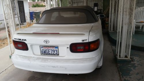 Selling a 93" Toyota Celica GT AS IS. Freshly painted white, few minor scratches, with a brand new black rag top installed. However, top does not go down. Needs to be put back on track, fairly easy job. I live in the I.E. area, LOCAL PICK-UP ONLY, NO SHIPMENT. Check Engine light is on, perhaps because it's been sitting for a few months, however the car drives smoothly. No AC. Power locks and windows. Brand new radio installed, cords for an amplifier are present and ready for hook up. New tires have been installed as well.