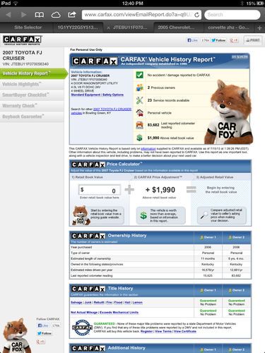 This is a 2007 Toyota FJ Cruiser w/ 85,000 miles, I am the second owner of this FJ Cruiser, and it is COMPLETELY loaded, I have not seen too many FJ's With The Options This One Has, The Book value plus Clean Car Fax is $24,284, and I am asking $19,999 ($4,285 Under Book Value), That is my very bottom dollar for this truck, it has never been driven off road, wrecked, smoked in, or abused, 4x4 (I have only put it in 4 wheel drive once or twice to see if it worked and it did), it was serviced by my local Toyota Dealership, when I was getting it ready to sale I put in a Brand new alternator and a BRAND NEW BATTERY (It was low, so I wanted to pass it on in perfect condition), I have posted pictures of the car fax for you too see, A/C ice cold, All scheduled maintenance, All records, Excellent condition, Looks & drives great, No accidents, Title in hand, Upgraded sound system, Well maintained, Thanks for looking, Call with any questions (2seven)0) Three92-one04four