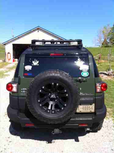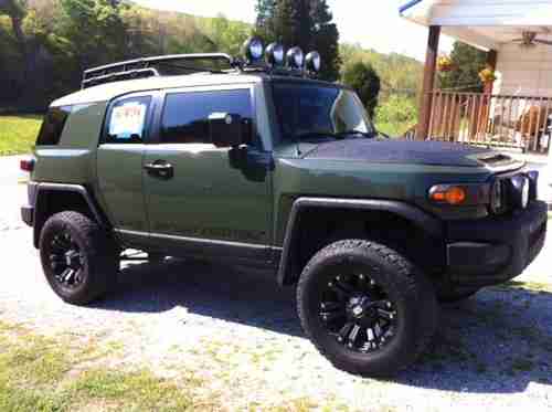 2011 Toyota FJ Cruiser customized by TopGunCustomz. 4.0 V6, 4X4, automatic, bluetooth wireless, JBL sound system, 24,800 miles, over 800 watts of off-road lighting, has a few dings on rear hatch but not very noticable, everything on this truck is in great condition, oil has been changed every 5000 miles, back-up camera, ARMY GREEN. lower trim, hood, and roof has Herculiner on it. Sharp truck!