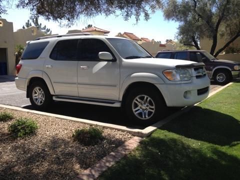 Pearl White Sequoia in excellent condition. 120k miles, Loaded luxury limited model with all bells and whistles. 2 wheel drive, traction control settings, NEW timing belt installed approx. 2 months ago, wood grain trim, gray leather, 4 bucket seats w/ 3rd row seating, DVD, navigation, CD JBL, heated seats, wireless headphones for DVD, rear AC/Heat control and vents, rear audio control, multiple seat memory, BRAND NEW tires, sun roof, high-low load height adjuster, running boards, hood protector, trailer receiver hitch. great vehicle in great condition. well maintained all records, clear title, serious inquiries only. Schedule for showing. Private seller. 16,000 obo