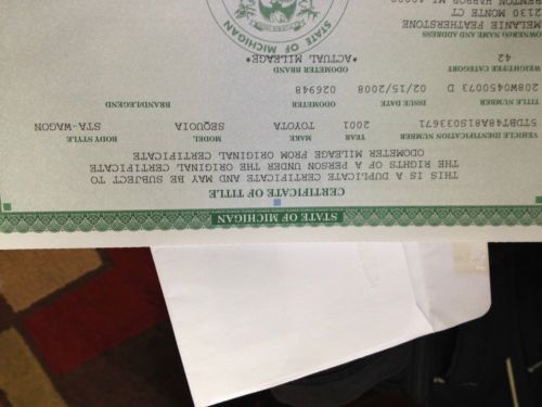 Fully loaded 2001 Toyota Sequoia. Well-maintained and clean inside and outside. There are some dings and minor scratches all around the vehicle due to normal wear and tear expected for a 2001 vehicle. Air conditioning and heating works well. Vehicle originally leased and sold as a Toyota certified pre-owned with approximately 27,000 miles. One owner after vehicle was leased. Vehicle now has just over 226,000 miles. It is still being used for carpools. Owner is getting rid of the vehicle because he purchased one with more fuel economy. Vehicle still gets 14-17 MPG. Oil changed at regular intervals. Timing belt has been replaced. Tread on tires is at least .25-.50 inches. Maintenance records can be checked through Signature Toyota Dealership and Sparkle Car Wash and Lube in Benton Harbor, Michigan. Since July 2010, vehicle resides in Round Rock, TX and maintenance records can be checked through Round Rock Toyota and Mister Car Wash and Lube. Small gap between rear bumper and vehicle body. |