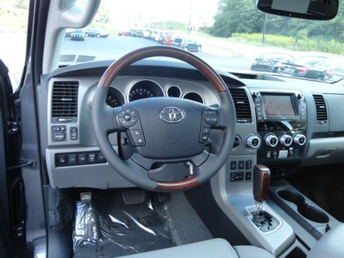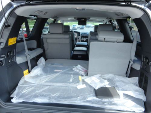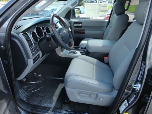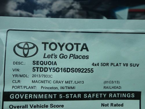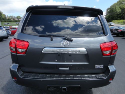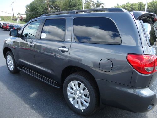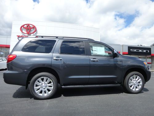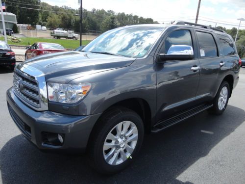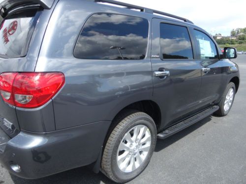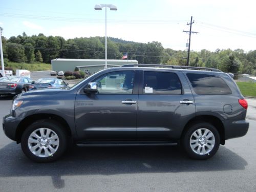 THANK YOU FOR VIEWING OUR BRAND NEW, JUST ARRIVED THIS MONTH, 2013 TOYOTA SEQUOIA PLATINUM 4X4 5.7L V8 WITH NAVIGATION, REAR DVD ENTERTAINMENT, REAR CAMERA, POWER MOONROOF, 2ND ROW HEATED BUCKET SEATS WITH CONSOLE, POWER LIFTGATE, ETC IN MAGNETIC GRAY METALLIC PAINT WITH GRAY HEATED / COOLED LEATHER SEATS AND 4 ACTUAL MILES! WE ARE A TOYOTA DEALERSHIP IN WESTERN PENNSYLVANIA AND THIS NEW 2013 SEQUOIA PLATINUM 4X4 HAS A MSRP OF $64,400. WE ARE OFFERING THIS FULLY LOADED SEQUOIA PLATINUM 4X4 AT A SPECIAL, DISCOUNTED 'BUY IT NOW' PRICE ON EBAY FOR A VERY LIMITED TIME. WE ARE ALSO OFFERING A LOW 2.99% APR UP TO 60 MONTHS WITH APPROVED CREDIT! PLEASE VIEW THE COMPLETE LISTING INCLUDING 24 PHOTOS ALONG WITH PHOTOS OF THE ACTUAL WINDOW STICKER. PLEASE CONTACT SCOTT LONG @ (866)226-0570 OR (814)659-1908 OR EMAIL TO LAUFORD@AOL.COM WITH ANY QUESTIONS. THANK YOU FOR VIEWING AND BE SURE TO VIEW ALL OF OUR EBAY LISTINGS IN OUR EBAY STORE AS WE ALSO HAVE A NEW 2014 SEQUOIA PLATINUM IN BLIZZARD PEARL PAINT! ALSO CHECK OUT OUR 100% POSITIVE FEEDBACK!