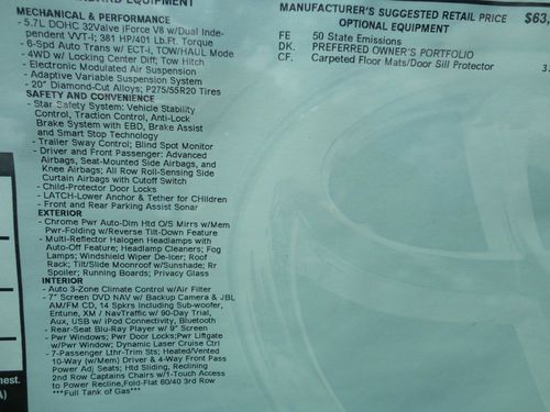 MECHANICAL & PERFORMANCE 5.7L DOHC 32Valve iForce V8 w/Dual Inde- pendent VVT-I; 381 HP/401 Lb.Ft. Torque 6-Spd Auto Trans w/ ECT-i, TOW/HAUL Mode 4WD w/ Locking Center Diff; Tow Hitch Electronic Modulated Air Suspension Adaptive Variable Suspension System 20" Diamond-Cut Alloys; P275/55R20 Tires SAFETY AND CONVENIENCE Star Safety System: Vehicle Stability Control, Traction Control, Anti-Lock Brake System with EBD, Brake Assist and Smart Stop Technology Trailer Sway Control; Blind Spot Monitor Driver and Front Passenger: Advanced Airbags, Seat-Mounted Side Airbags, and Knee Airbags; All Row Roll-Sensing Side Curtain Airbags with Cutoff Switch Child-Protector Door Locks LATCH-Lower Anchor & Tether for CHildren Front and Rear Parking Assist Sonar EXTERIOR Chrome Pwr Auto-Dim Htd O/S Mirrs w/Mem Pwr-Folding w/Reverse Tilt-Down Feature Multi-Reflector Halogen Headlamps with Auto-Off Feature; Headlamp Cleaners; Fog Lamps; Windshield Wiper De-Icer; Roof Rack; Tilt/Slide Moonroof w/Sunshade; Rr Spoiler; Running Boards; Privacy Glass INTERIOR Auto 3-Zone Climate Control w/Air Filter 7" Screen DVD NAV w/ Backup Camera & JBL AM/FM CD, 14 Spkrs Including Sub-woofer, Entune, XM / NavTraffic w/ 90-Day Trial, Aux, USB w/ iPod Connectivity, Bluetooth Rear-Seat Blu-Ray Player w/ 9" Screen Pwr Windows; Pwr Door Locks;Pwr Liftgate w/Pwr Window; Dynamic Laser Cruise Ctrl 7-Passenger Lthr-Trim Sts; Heated/Vented 10-Way (w/Mem) Driver & 4-Way Front Pass Power Adj Seats; Htd Sliding, Reclining 2nd Row Captains Chairs w/1-Touch Access to Power Recline,Fold-Flat 60/40 3rd Row Total Vehicle Base Model ..........................: $ 63070.00 50 State Emissions ......................... PREFERRED OWNER''S PORTFOLIO ................ Carpeted Floor Mats/Door Sill Protector .... 335.00 Total Accessories ...........................: $ 335.00 Destination Charge ..........................: $ 995.00 Total .......................................: $ 64400.00