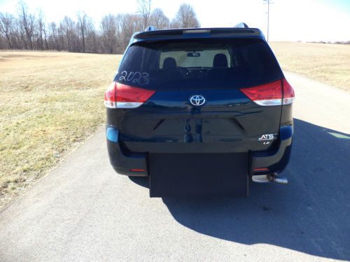 UP FOR SALE IS A 2011 TOYOTA SIENNA WHEELCHAIR/HANDICAP RAMP VAN. THIS VAN HAS THE ATS ADVANTAGE RE L REAR ENTRY WHEELCHAIR CONVERSION . IT HAS THE MANUAL, DUAL LOCKING, NON SKID, ADA 36 INCH WIDE RAMP WITH THE ATS DUAL PISTON SHOCK ASSIST SYSTEM. THIS VAN WILL TRANSPORT LARGER WHEELCHAIRS AND SCOOTERS. THE RAMP STOWS AND DEPLOYS WITH EASE WITH THE SHOCK ASSIST SYSTEM. THE VAN COMES WITH ONE COMPLETE Q-STRAINT WHEELCHAIR RESTRAINT SYSTEM WHICH INCLUDES FOUR RETRACTABLE WHEELCHAIR STRAPS AND FULL BELT SYSTEM. EVERYTHING NEEDED TO TRANSPORT YOUR WHEELCHAIR IS INCLUDED IN THIS SALE. THE VAN JUST HAS HAD ASE INSPECTION AND SERVICE LAST WEEK AND IS READY TO GO. THE CONVERSION IS UNDER THE ATS ADVANTAGE WARRANTY WHICH IS A THREE YEAR WARRANTY ON ALL CONVERTED PARTS. THE VAN HAS POWERTRAIN WARRANTY LEFT AT TOYOTA. THIS VANS INTERIOR IS WELL KEPT IN GREAT CONDITION. THE EXTERIOR ALSO IS SUPER NICE WITH NO KNOWN DAMAGE AND NORMAL WEAR. THE VAN IS AVAILABLE FOR TEST DRIVES AND INSPECTIONS DAILY AT OUR LOCATION BEFORE AUCTION ENDS. WE CAN FINANCE THIS UNIT TO BUYERS WITH APPROVED CREDIT BUT YOU MUST CALL FIRST BEFORE BUYING FOR CREDIT CHECK AND APPROVAL. PLEASE HAVE ALL FUNDS SECURED BEFORE BUYING AND BE READY TO MAKE THE 500.00 NON REFUNDABLE DEPOSIT WITHIN 24 HRS OF AUCTION ENDING. FULL PAYMENT IS DUE WITHIN 7 DAYS OF AUCTION ENDING. WE CAN SHIP VAN ANYWHERE AT BUYERS EXPENSE BUT UNIT MUST BE PAID IN FULL BEFORE IT SHIPS. WE ALSO OFFER DAILY DROP OFF OF VANS AT THE LOUISVILLE KY OR NASHVILLE TN AIRPORTS. FOR QUESTIONS ON THIS VAN EMAIL OR CALL ROB @ 270 634 1466 OR RON @ 270 634 0721. THANKS AND CHECK US OUT AT ATSMOBILITY.COM
