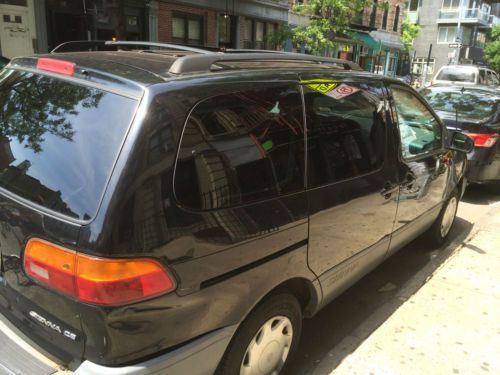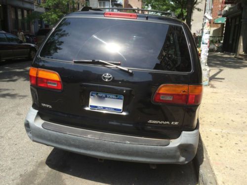 For sale is this 1999 Toyota Sienna CE. 125K miles. First 67K miles were while the van lived in the suburbs in Connecticut -- the other half in NYC. It runs very well, engine is in good shape. As you can see in the photos (I have more as well), lots of dents, dings, scrapes, scratches and bruises from years of being parked on the street in NYC – plus a couple of minor fender-benders – but it has never been in any serious accident. In recent years I’ve put in a new catalytic converter, new timing belt, new window regulators, new front brakes and brake pads, new shocks and struts, new battery, new winter wipers, new corner lights, new grille, so these parts are all much newer than the car. Oil and fluid changes have been regular and upkeep has been good. Interior is also somewhat scuffed up – several marks and stains on seats from hauling equipment and bikes around, one rear seat seatbelt is cut, one door button sticks a bit, small hole in plastic in rear light, one bad armrest, a few things like that. It's not as pretty as it once was, but it runs fine and the engine and all insides of it seem to be in fine shape. Thanks for your interest!