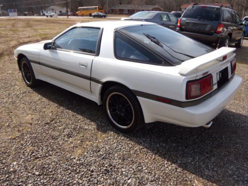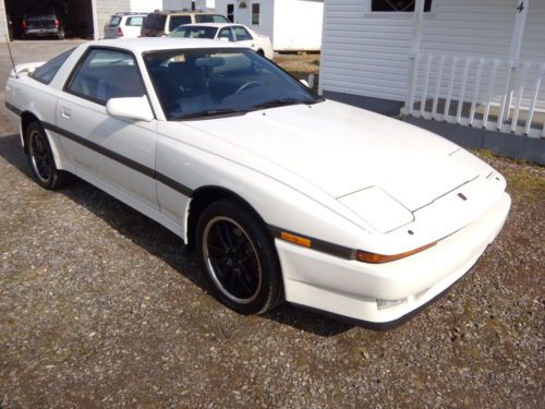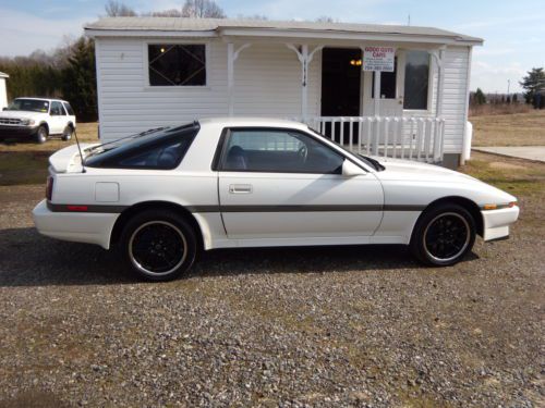 1987 TOYOTA SUPRA TURBO,PEARL WHITE WITH BLUE INTERIOR,TURBO CHARGED INLINE 3.0 6 CYLINDER WITH FACTORY TURBO CHARGER,AUTOMATIC TRANSMISSION, COLD AIR CONDITIONING,HAS AFTER MARKET BLACK WHEELS(I DONT KNOW BRAND),SOMEONE ADDED A TURBO TIMER WHICH LETS ENGINE RUN UP TO 30 SECONDS AFTER YOU TURN OFF KEY TO MAKE SURE TURBO GETS OIL.IT HAS AN AFTER MARKET RADIO WITH CD.THIS CAR RUNS AND DRIVES GREAT.VERY NICE CONDITION FOR 27 YEARS OLD THE VINYL DASH HAS SOME CRACKS AND HAS A CARPETED DASH COVER.THE ENGINE STARTS AND RUNS GREAT.THE AUTOMATIC TRANSMISSION SHIFTS VERY WELL.THE HEADLIGHTS OPEN AND CLOSE WELL.THE BODY IS VERY GOOD WITH GOOD PAINT EXCEPT THE PAINT ON THE SPOILER IS CRACKING IF YOU LOOK CLOSELY. I HAVE DESCRIBED VEHICLE AS WELL AS I COULD.ANY QUESTIONS PLEASE ASK THROUGH EBAY OR CALL 704-902-2221.THANKS,JC ELLER tHIS VEHICLE IS ALSO FOR SALE LOCALLY AND WE RESERVE THE RIGHT TO END AUCTION EARLY.THANKS AND HAPPY BIDDING,GOOD GUYS CARSNC.COM |