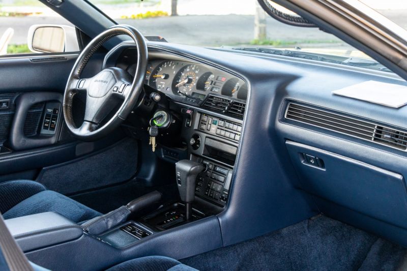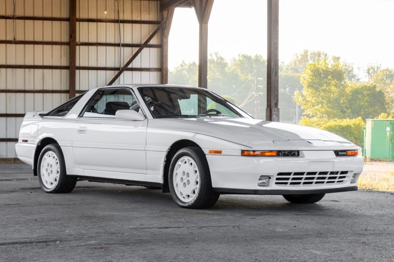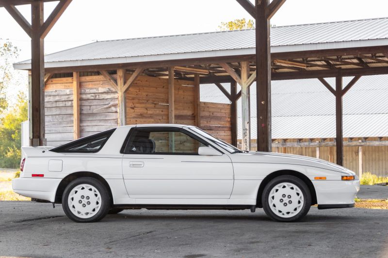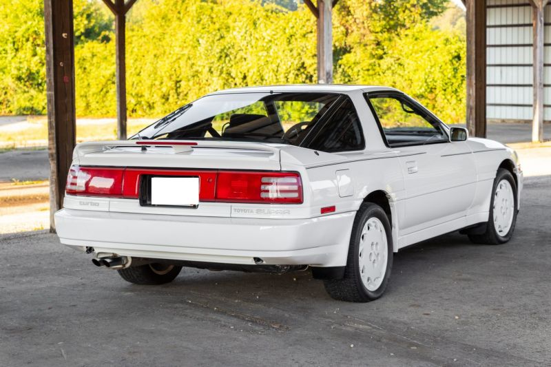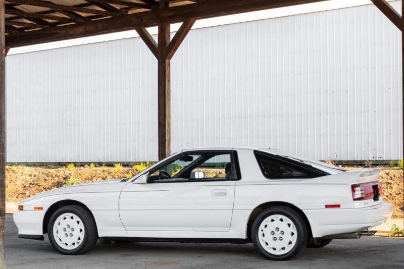 1989 Toyota Supra Turbo is finished in white over blue cloth and is powered by a turbocharged 3.0-liter inline-six paired with a four-speed automatic transmission and a limited-slip differential. Equipment includes 16" alloy wheels, the Sport Package, White Exterior package, pop-up head lights, a removable Targa panel, integrated front fog lights, automatic climate control,an electronically adjustable suspension system, cruise control, and a factory stereo.